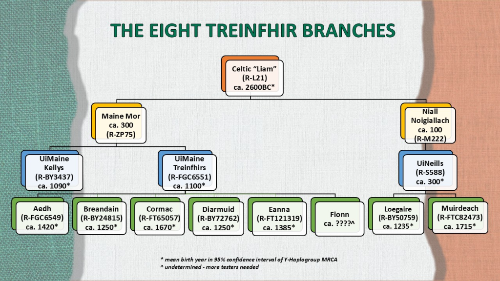 The Treinfhir DNA initiative uses “Y-DNA” which Treinfhirs inherited from their distant male Treinfhir ancestors and seeks to answer key questions like “What Treinfhirs and family groups am I connected to in Ireland?”, “How long ago did my ancestors branch away from other families?” and “How are the Treinfhir families in Ireland related to each other?”